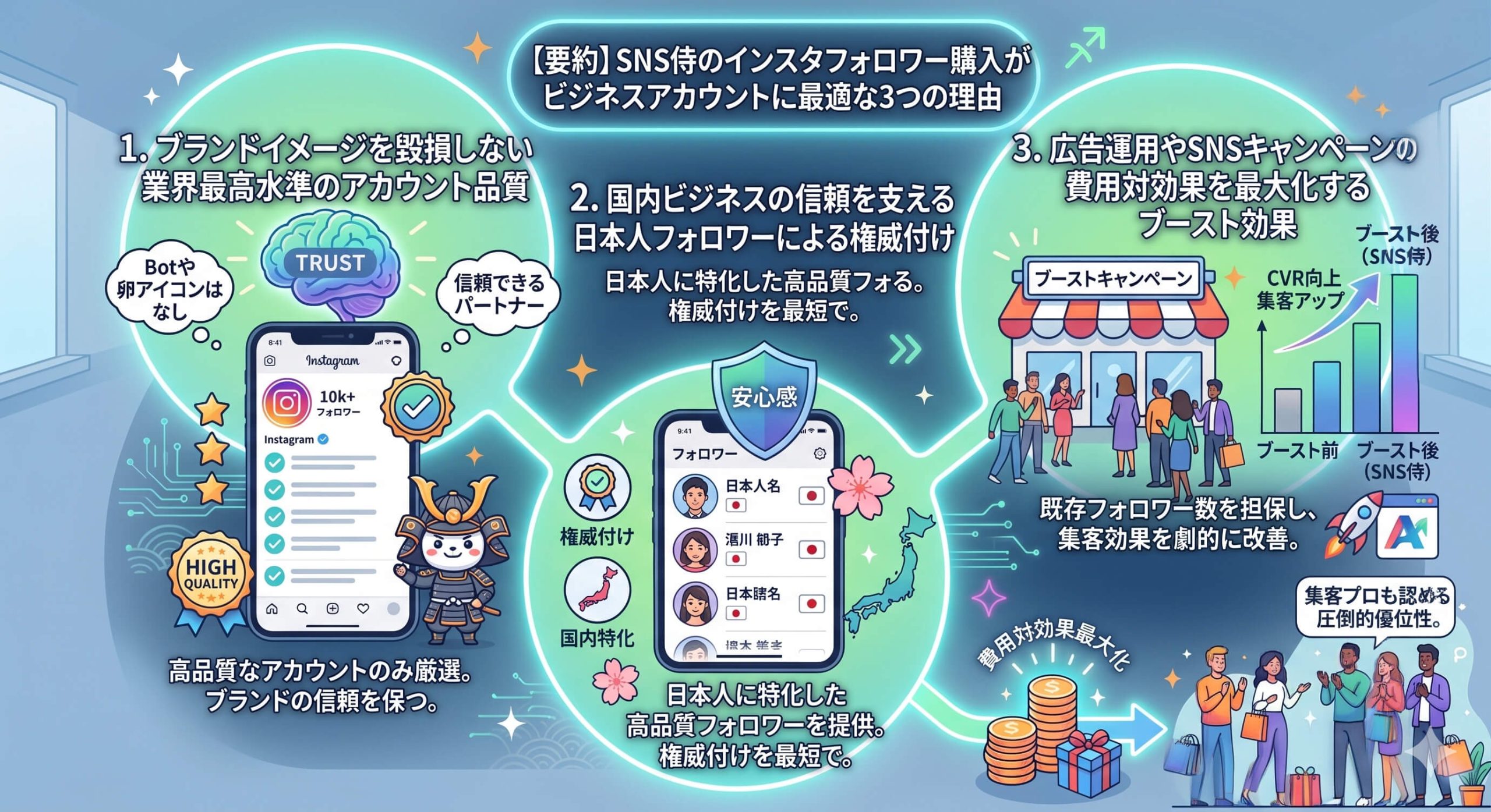 本記事では、インスタフォロワー購入がいかにしてビジネスの売上に直結するのか、そのマーケティング的価値を解説します。さらに、ブランドイメージを損なわず、高品質な社会的証明を提供する「SNS侍」が、なぜ集客のプロに選ばれ続けているのか、その理由を徹底的に紐解きます。