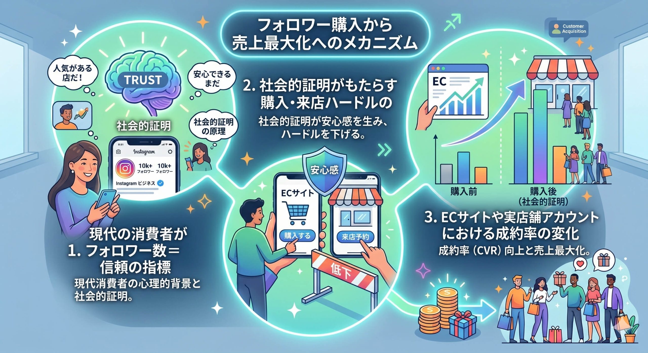 この判断基準に最も影響を与えるのがフォロワー数です。ここでは、フォロワーを増やすことがいかにしてビジネスの数字、つまり「売上」に変換されるのか、そのマーケティングロジックを解説します。