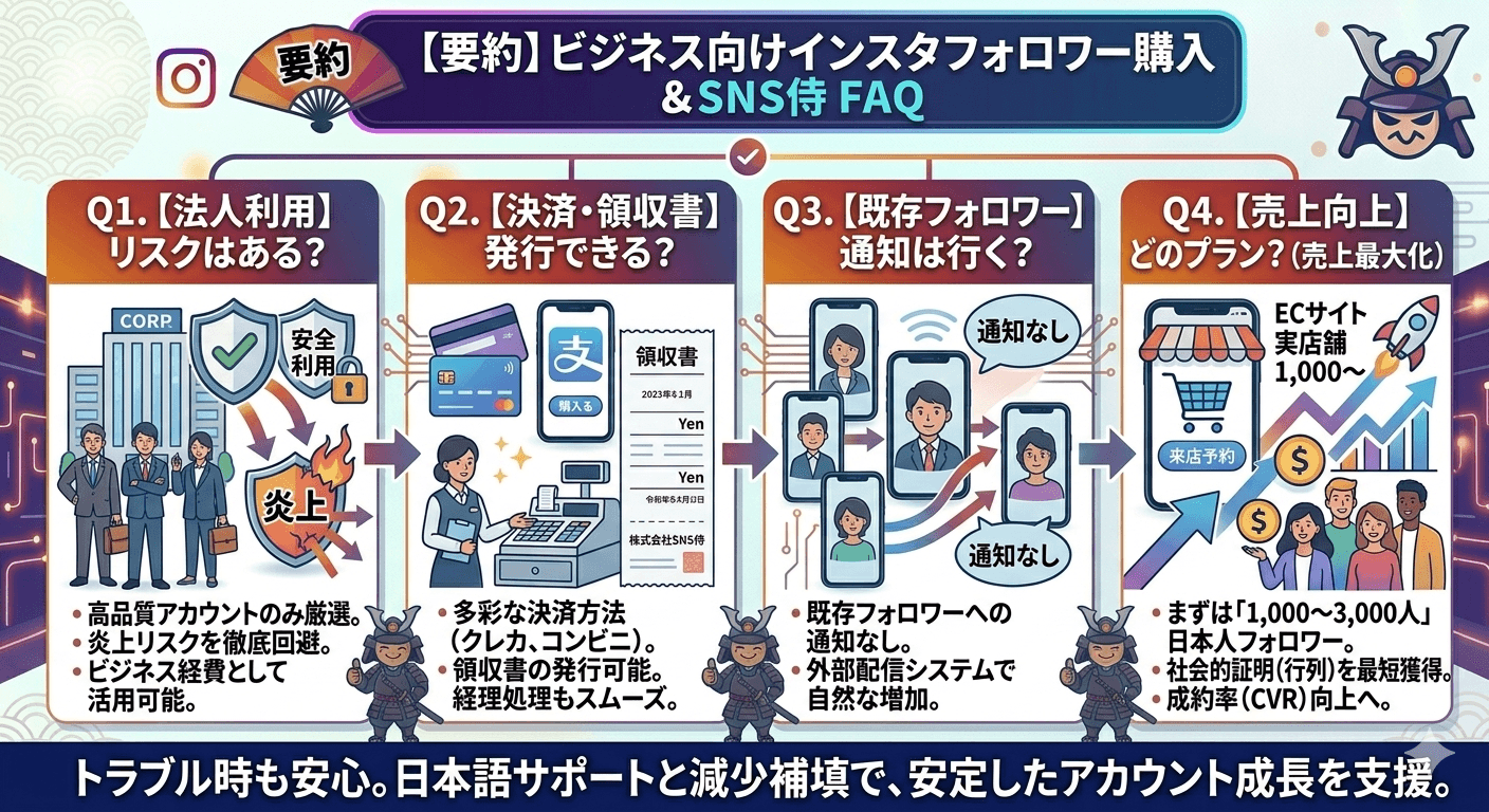 ここでは、ビジネス利用を検討されている担当者様から特に多く寄せられる「インスタフォロワー購入とSNS侍の安全性」にまつわる疑問をまとめました。投資を成功させ、着実に成果を出すための最終確認としてご活用ください。